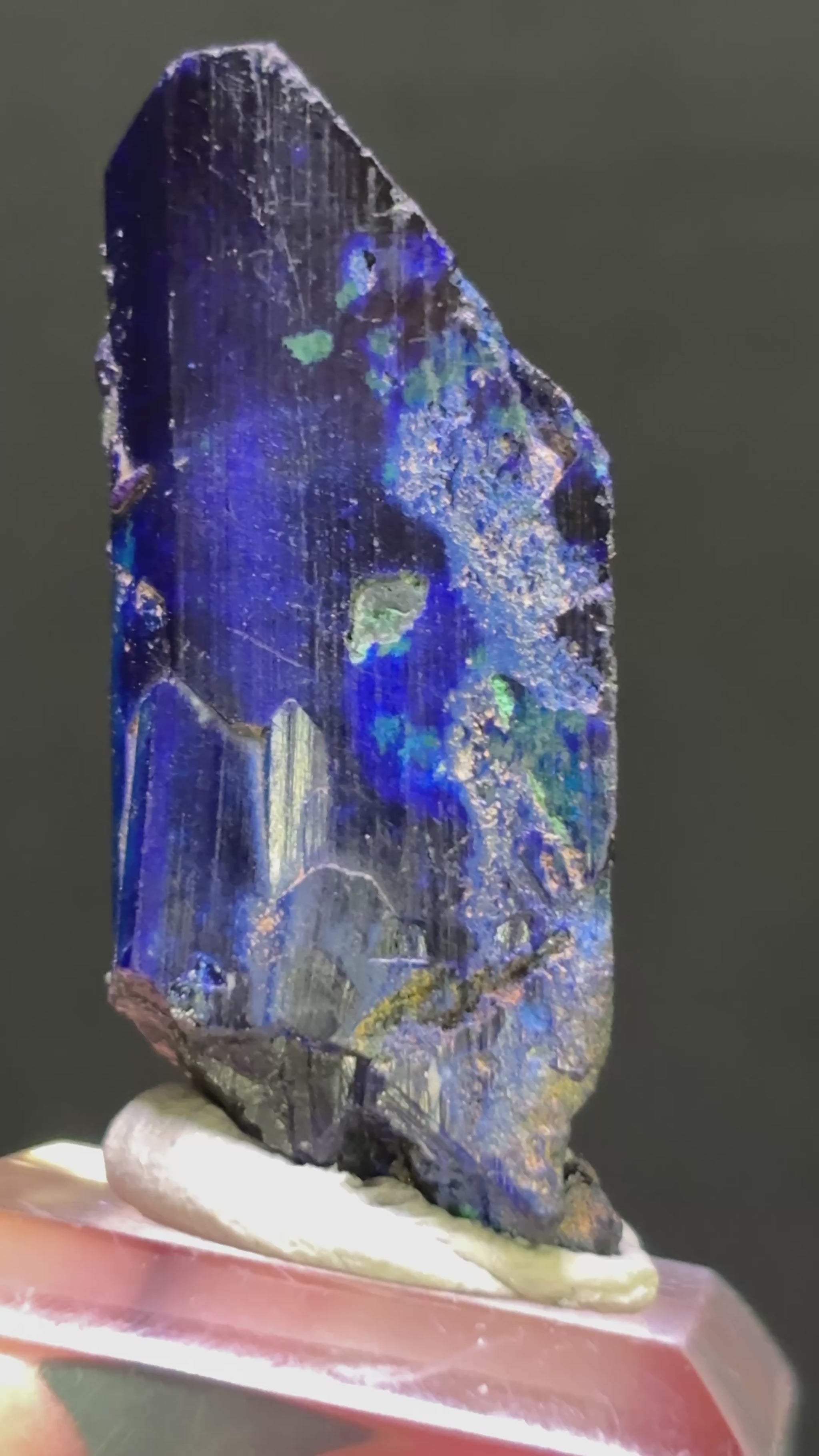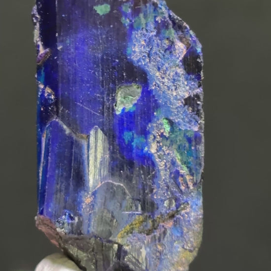 Excellent well formed Azurite crystal from the Tsumeb mine, Oshikoto, Namibia. This piece has a gradient of blue from a royal blue to a darker navy color. In some areas it has green from minor malachite growth as well. This piece measures 71x51x35mm and is 136 grams.