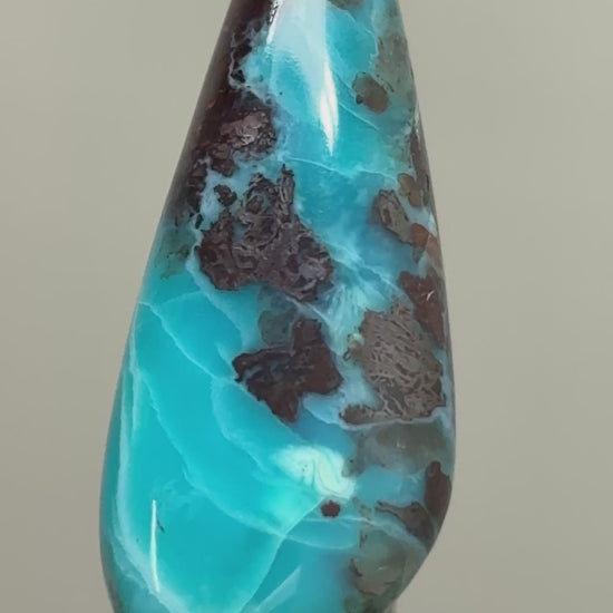 Caribbean blue gem silica and cuprite come together to create a really nice contrast in this cabochon. This piece is an elongated free form tear drop shape and was cut in house here at Matt Reavis Minerals. The cuprite is more of a rust red color in person but wasn't appearing so on camera. The rough that this was cut from came from a find in Namibia. Measures 31x12x5mm and is 10.8 carats.