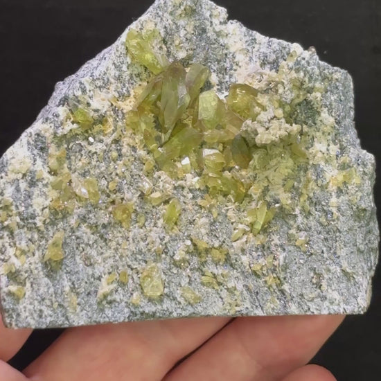 Beautiful green Titanite crystals on Pericline and feldspar matrix from the Tormiq Valley, Haramosh Mountains, Gilgit-Baltistan, Pakistan. These are well formed apple green crystals centered nicely in the middle of this piece. The crystals exhibit excellent luster and the wedge shape that sphene is known for. This is a superb example of this material. Measures 8.9x7.7x2.7cm and weighs 229 grams