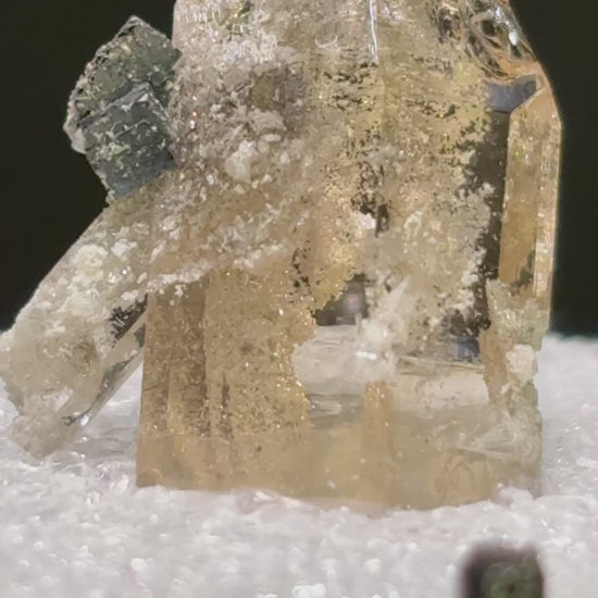 Superb thumbnail specimen of topaz accented with bixbyite cubes. The topaz is very gemmy and has some aesthetic inclusions. This is a very attractive piece with excellent luster and form. From Juab County, Utah. Measures 16x16x10mm and comes mounted in a standard size thumbnail box.