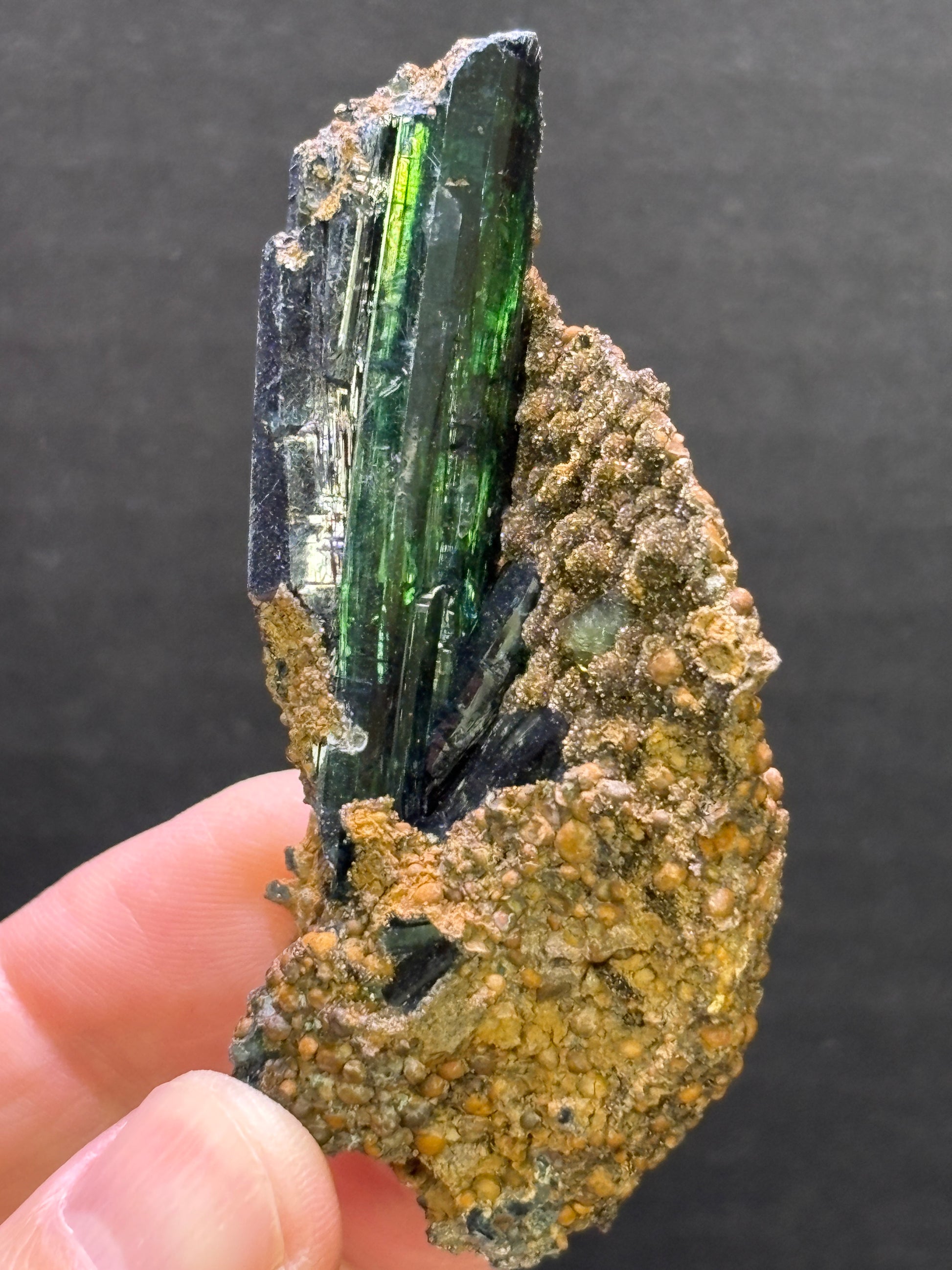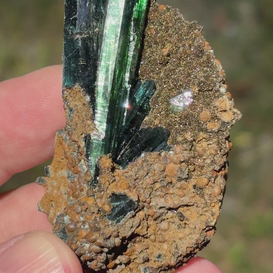 Deep emerald-green Vivianite crystal accented by a nicely terminated ludlamite in a siderite matrix. The ludlamite and siderite perfectly accent the large green vivianite creating a very nice aesthetic. This piece is from the Cabeça do Cachorro claim in the Amazonas state, Brazil. It measures 80x42x30mm 68 grams.